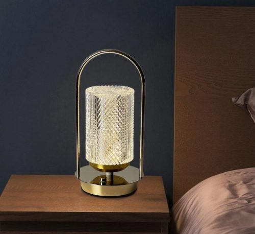 A lámpát egy arany tónusú, ívelt fémkeret öleli körbe, amely lámpás‑szerű, modern megjelenést kölcsönöz neki. A masszív fém talp biztos stabilitást ad, így a lámpa nemcsak dekoratív, hanem tartós és megbízható kiegészítője is az otthonnak.