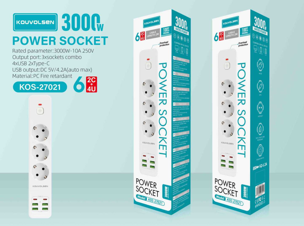 A KOUVOLSEN KOS‑27021 egy nagy teljesítményű, modern és biztonságos elosztó, amelyet kifejezetten a mai eszközigényekhez terveztek. A 3000W‑os terhelhetőség, a 3 hagyományos aljzat, a 4 USB port és a 2 Type‑C csatlakozó együtt minden otthonban és irodában nélkülözhetetlen társ.