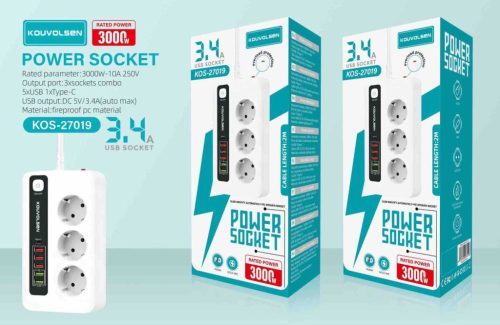 A KOUVOLSEN KOS‑27019 egy nagy teljesítményű, modern és biztonságos elosztó, amelyet kifejezetten a mai, sok eszközt használó háztartások és irodák igényeire terveztek. A 3000W‑os terhelhetőség, a 3 hagyományos aljzat, az 5 USB port és az 1 Type‑C PD gyors­töltő együtt egy rendkívül sokoldalú, megbízható és gyors töltési megoldást kínál.
