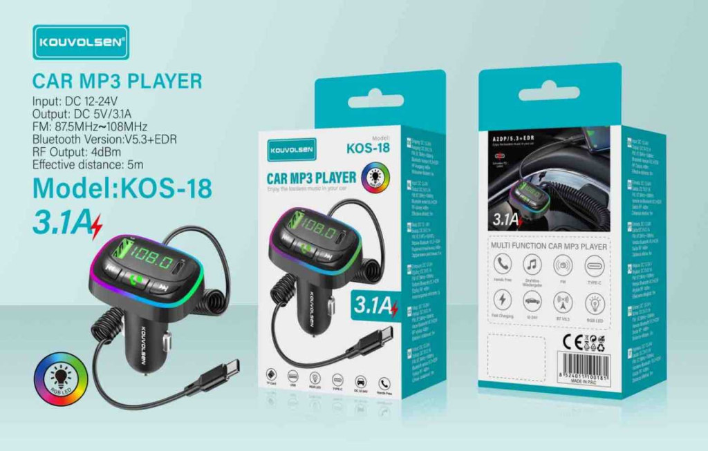 A KOUVOLSEN KOS‑18 egy modern, sokoldalú autós MP3 lejátszó, amely ideális megoldás minden olyan járműbe, ahol nincs beépített Bluetooth vagy USB zenelejátszás. A készülék a szivargyújtó aljzatba csatlakozik, és vezeték nélküli kapcsolatot biztosít a telefon és az autórádió között, miközben gyors­töltési lehetőséget is kínál.