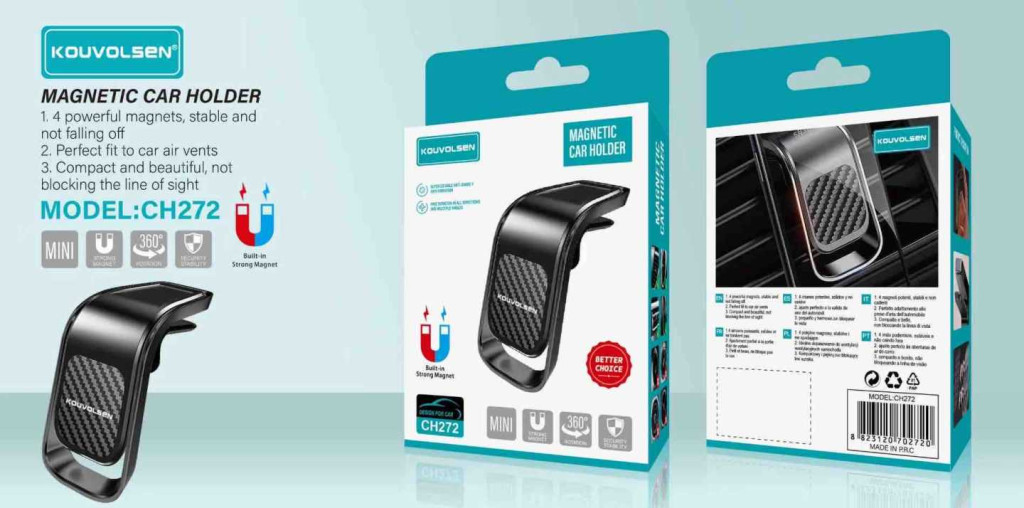 A KOUVOLSEN CH272 mágneses autós telefontartó a modern sofőrök igényeire készült: erős mágnesekkel, elegáns kialakítással és 360°‑os forgathatósággal biztosítja, hogy a telefon mindig stabilan, jól látható helyen legyen – anélkül, hogy zavarná a kilátást.