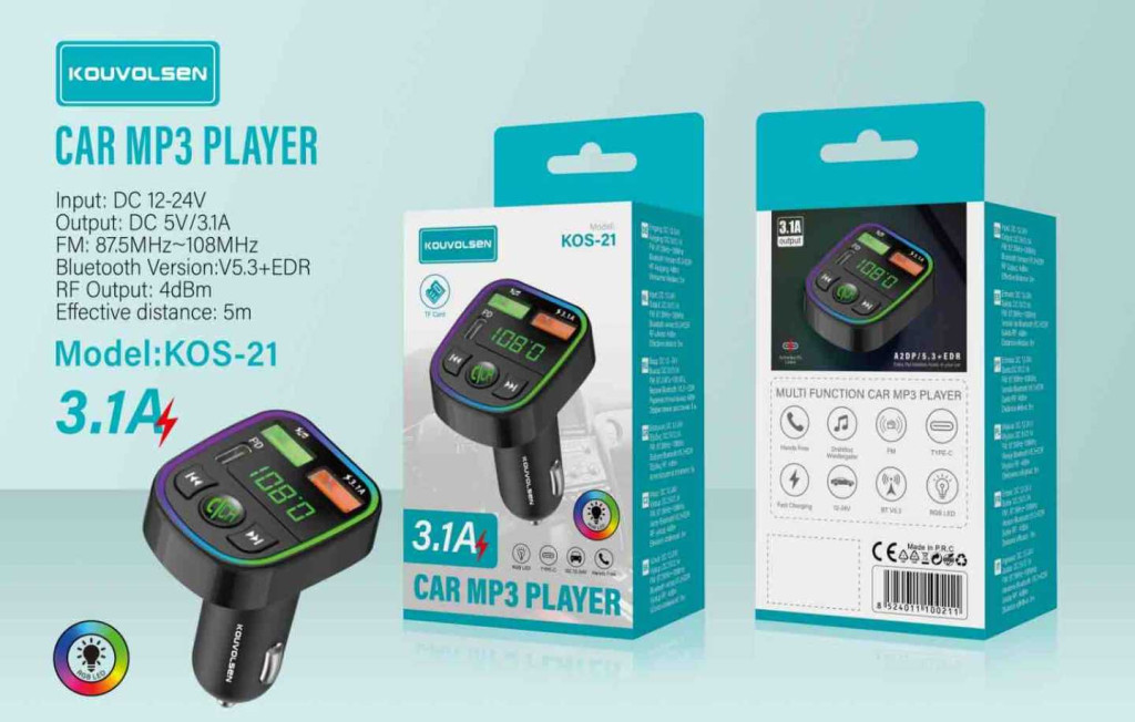 A KOUVOLSEN KOS‑21 egy modern, sokoldalú autós MP3 lejátszó, amely ideális választás minden olyan autóhoz, ahol nincs beépített Bluetooth vagy USB zenelejátszás. A készülék egyszerűen a szivargyújtó aljzatba csatlakozik, és azonnal vezeték nélküli kapcsolatot biztosít a telefon és az autórádió között.